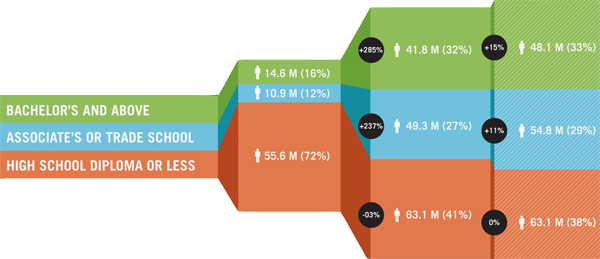 Some common problems are abound in this infographic that are also apparent in other analysis. The “completion rate” of two-year colleges is underestimated since many students transfer to four-year universities instead of completing a degree. There is also a lot of pressure on colleges here, but there is an entire pipeline–from birth through school–that needs to be addressed.
