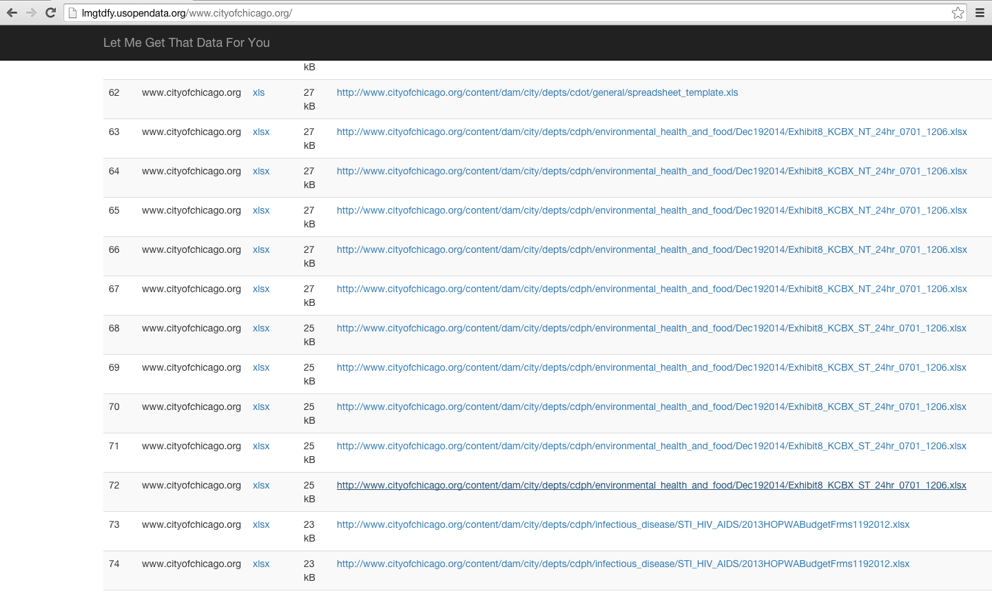 Visit the website to enter a URL, which scans all the websites (the entire domain) and subdomains for the applicable file types. You can browse the results to see if there are any files currently posted that can be posted on the portal. Below, a scan of www.cityofchicago.org shows some results. After further inspection, many of these files are “forms” in Excel and not a good fit for the open data portal. However, there are some promising leads for our team.